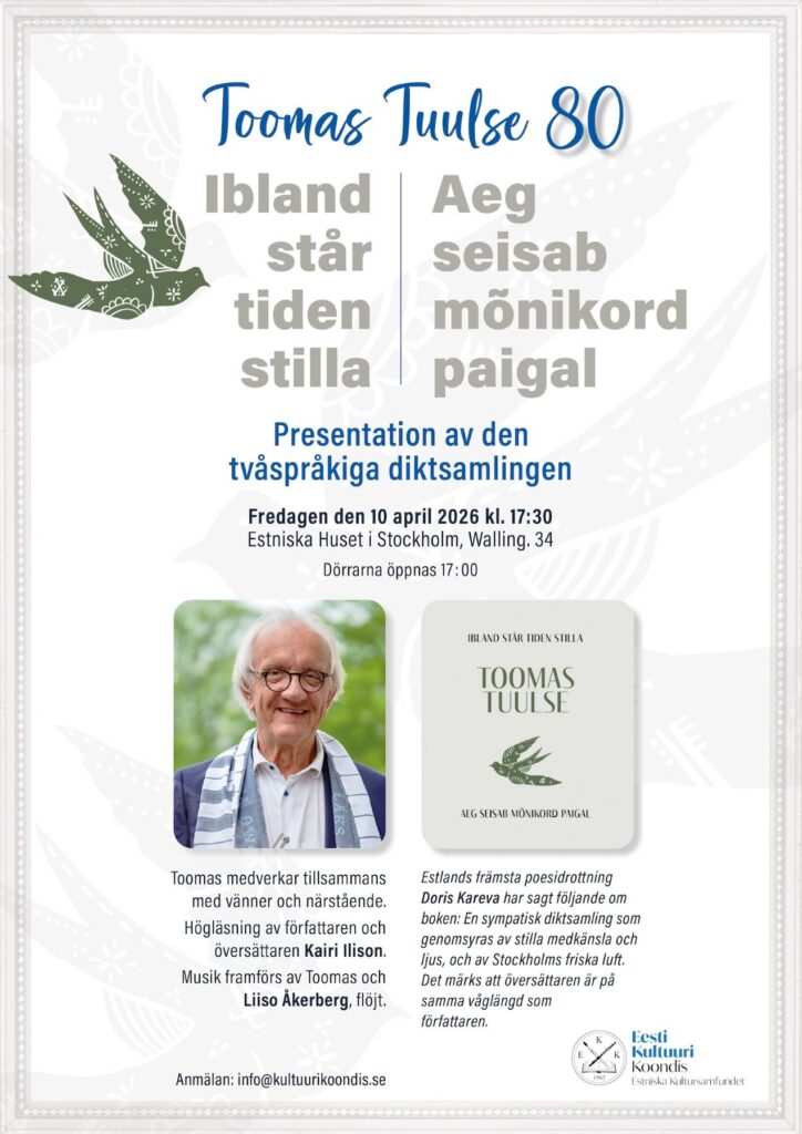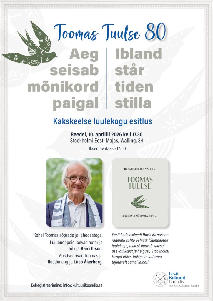 Avaleht Kalender Toomas Tuulse 80 – luulekogu esitlus / presentation av diktsamlingen Toomas Tuulse 80 – luulekogu esitlus / presentation av diktsamlingen Hinnatud rootsieesti kultuuritegelane Toomas Tuulse üllitas 80. juubeli puhul kakskeelse luulekogu + Lisa Google kalendrisse + iCal / Outlook eksport 00 päeva 00 tundi 00 minutit 00 sekundit Kuupäev 10 apr. 2026 Aeg 17:30 - 18:00 Toimumiskoht Stockholmi Eesti Maja Wallingatan 34, 2 tr, 111 24 Stockholm Veebileht http://www.eestimaja.se/ Korraldaja Eesti Kultuuri Koondis Rootsis Tel 08-411 31 16 E-post es.si1774471191dnook1774471191iruut1774471191luk@o1774471191fni1774471191 Veebileht https://kultuurikoondis.se/ Jaga sündmust